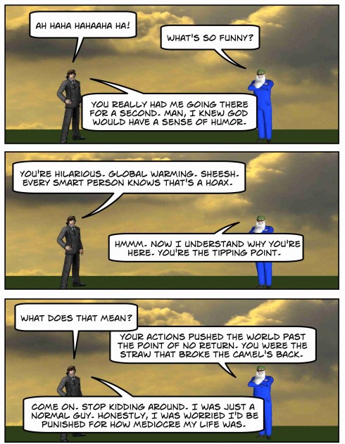 Once upon a time, God forced Loki to work the gate to the afterlife ushering the recently deceased to the underworld. Bored to death, Loki and his friends decided to pass the time by taunting humans for their mistakes in life. This is Loki and his friends’ 34th victim.