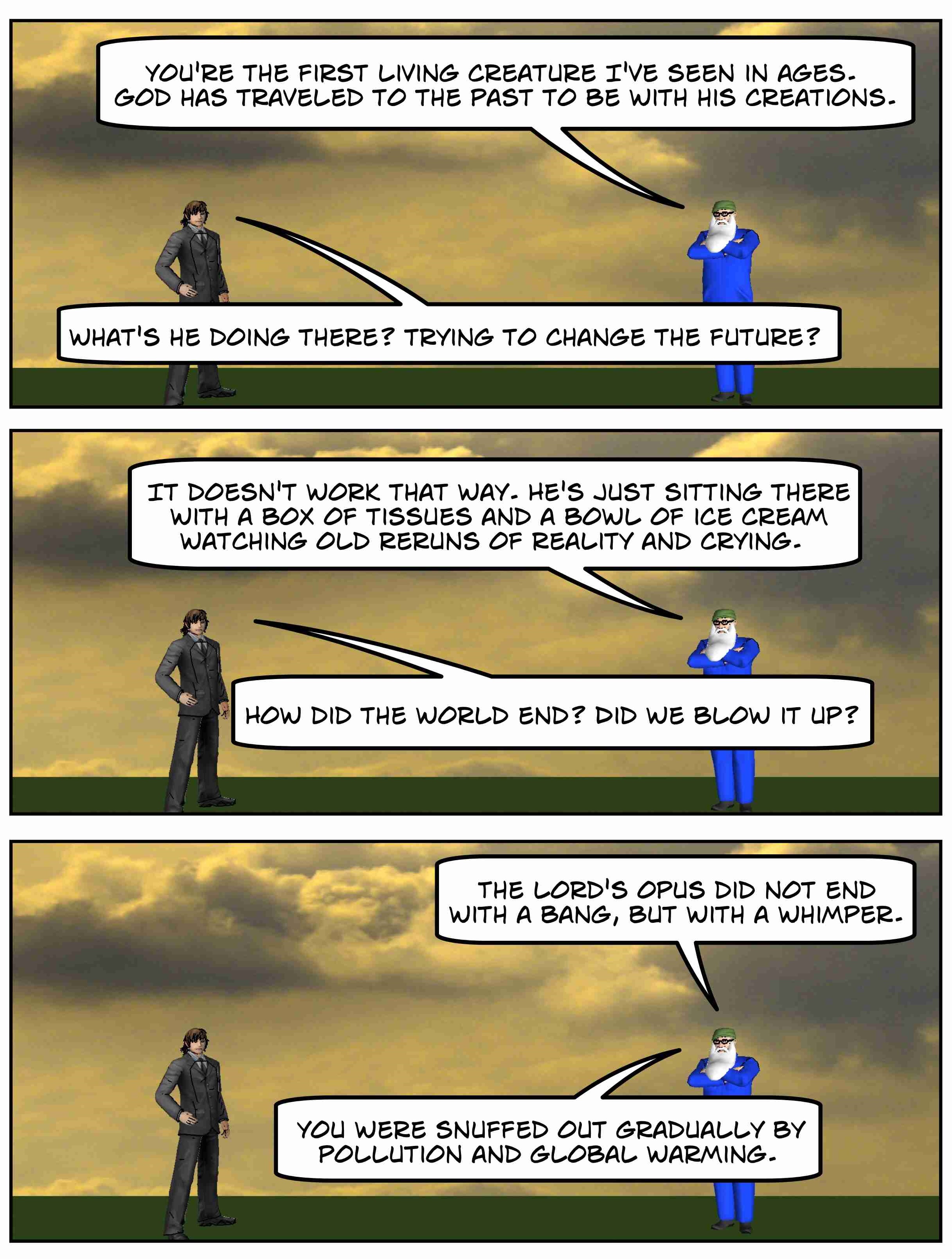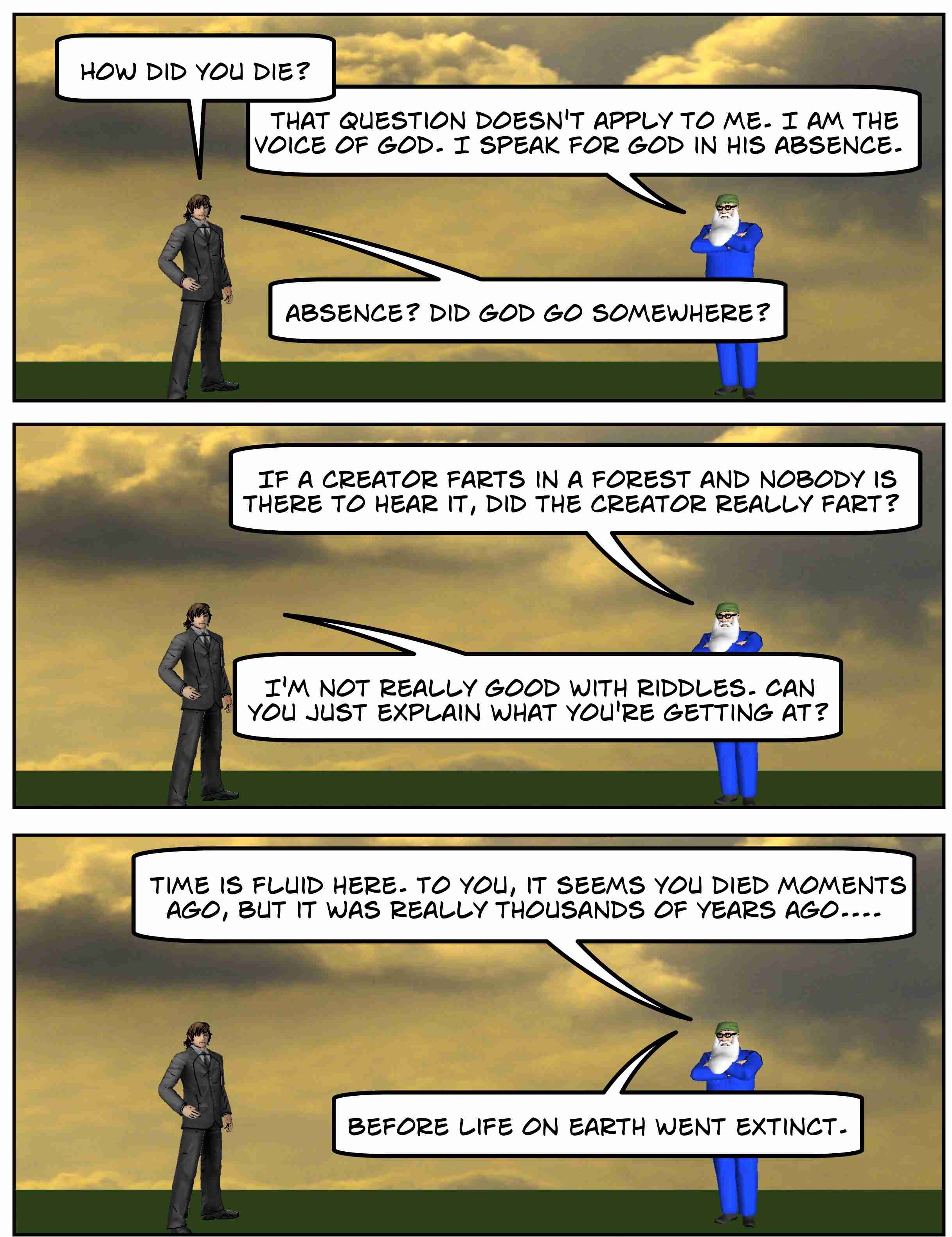 Once upon a time, God forced Loki to work the gate to the afterlife ushering the recently deceased to the underworld. Bored to death, Loki and his friends decided to pass the time by taunting humans for their mistakes in life. This is Loki and his friends’ 34th victim.