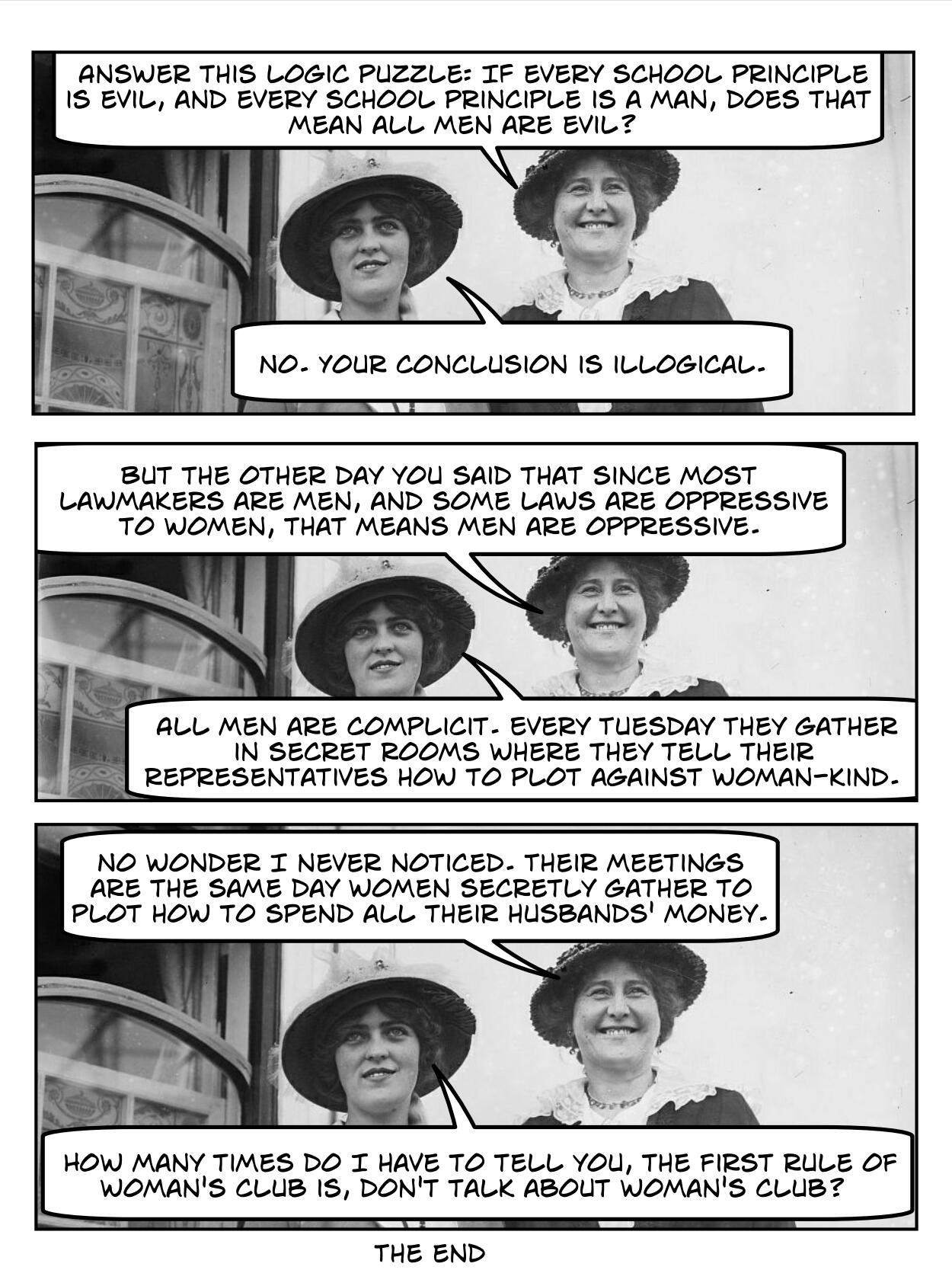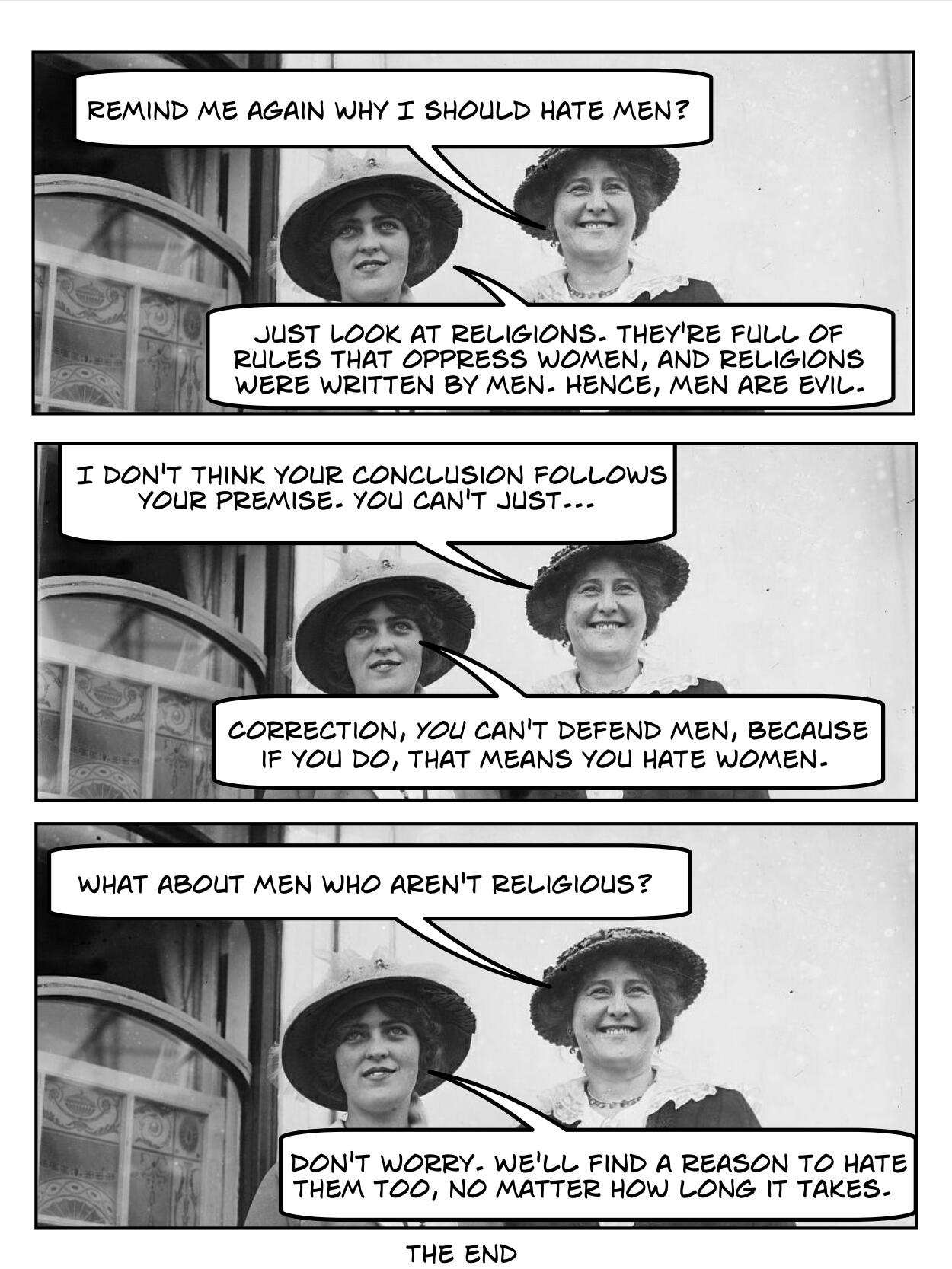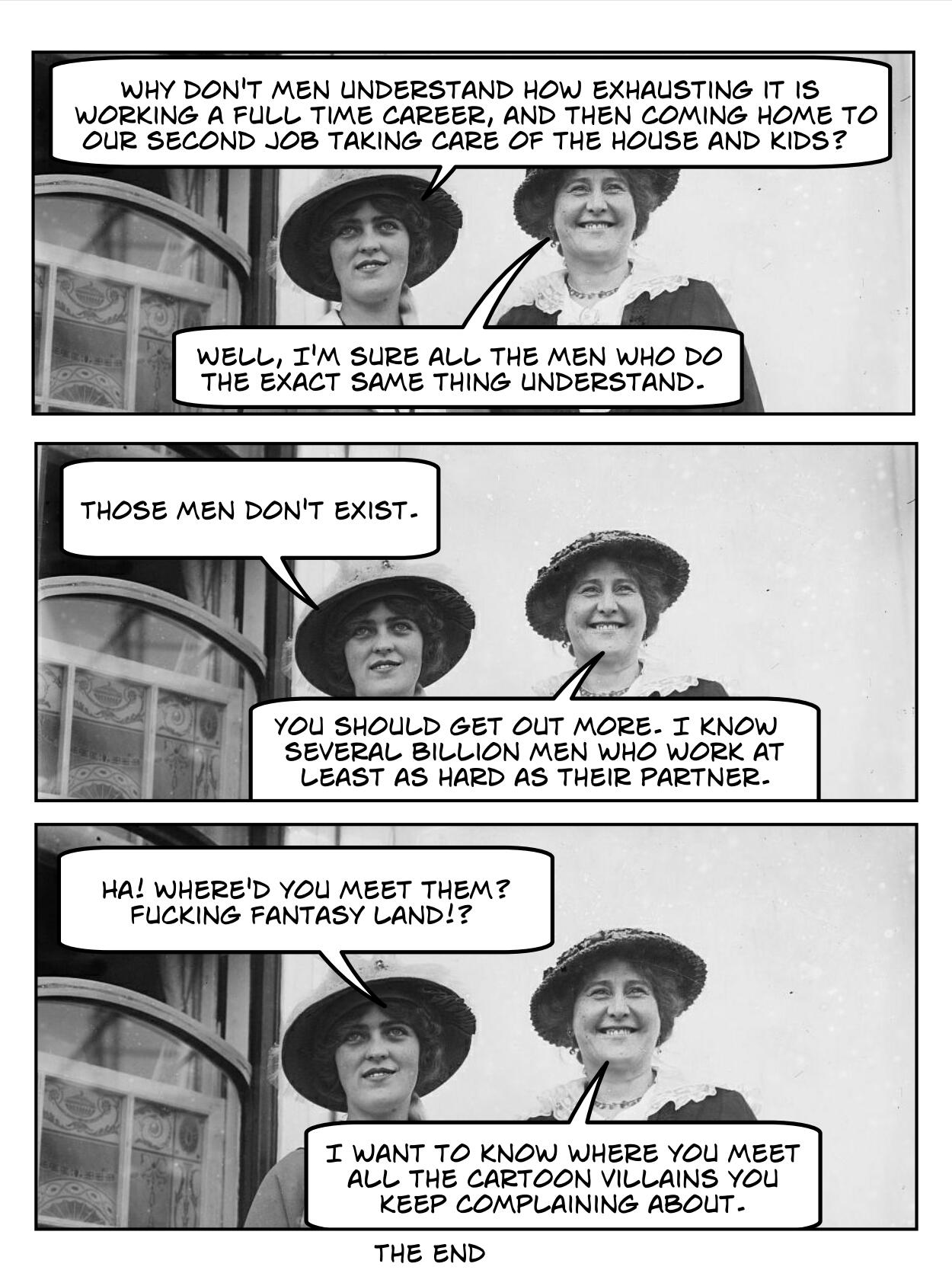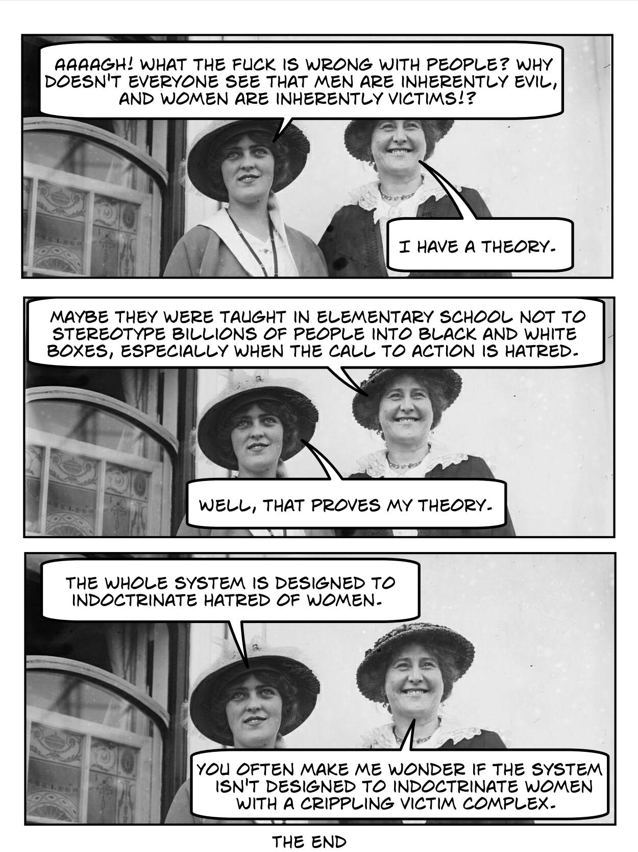 “Two Feminist Ladies” is a series of dark-humored, satirical, three-panel comic strips about two old fashioned women discussing modern radical Feminist talking points.