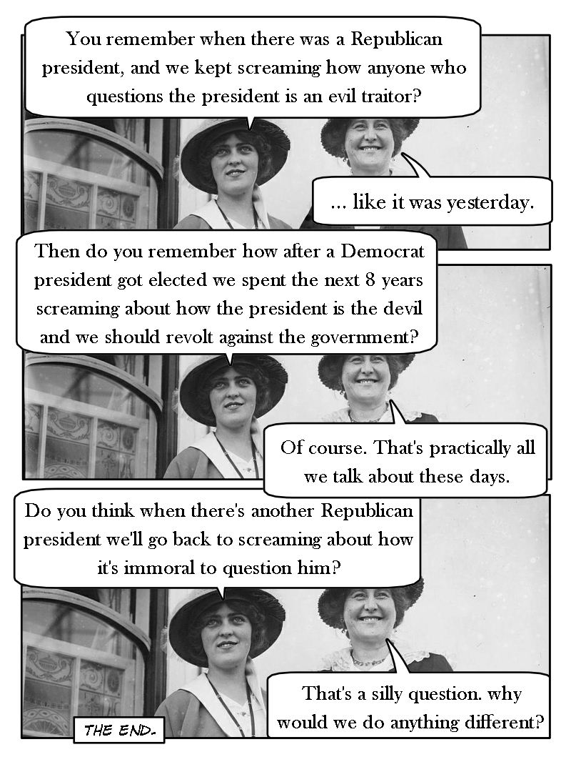 Lady #1: You remember when there was a Republican president in office, and we kept screaming about how anyone who questions the president is an evil traitor?