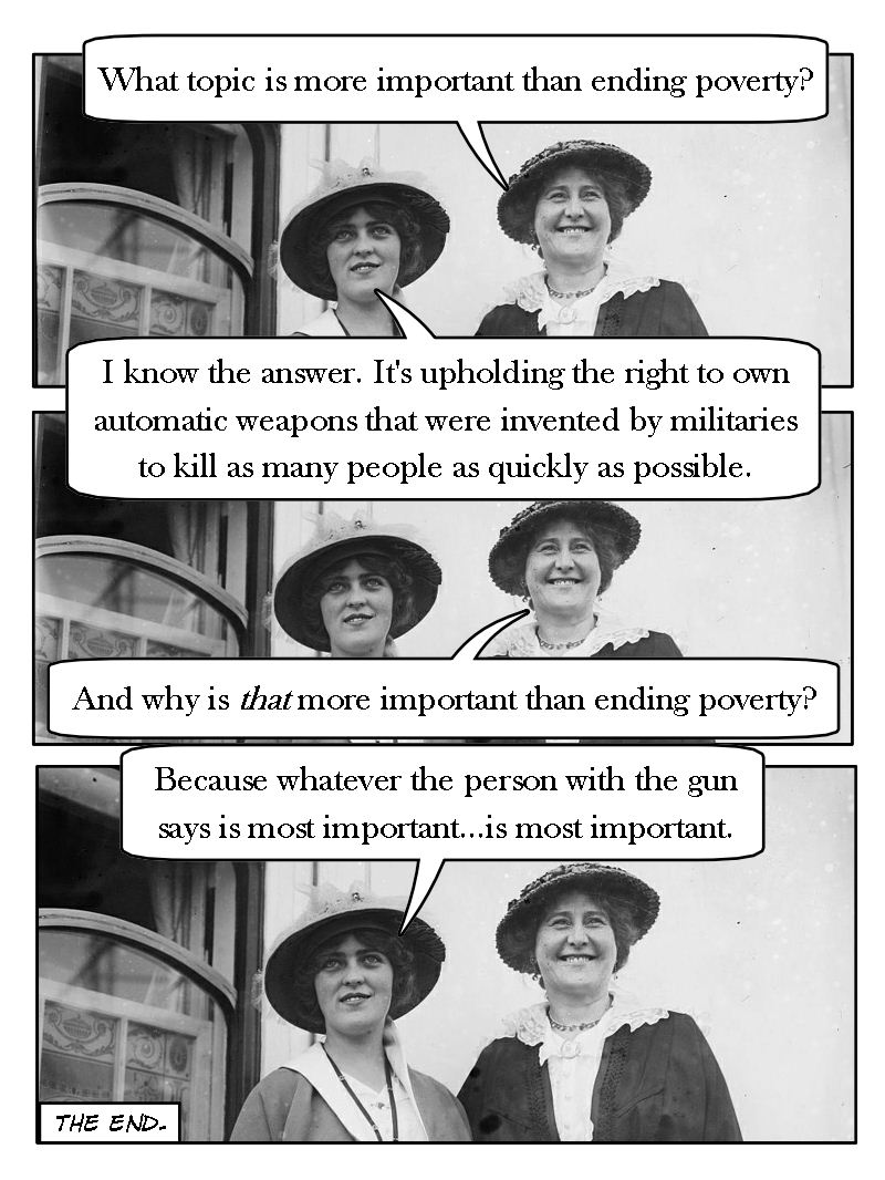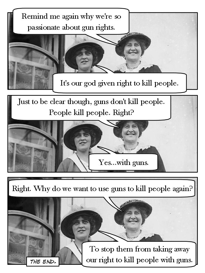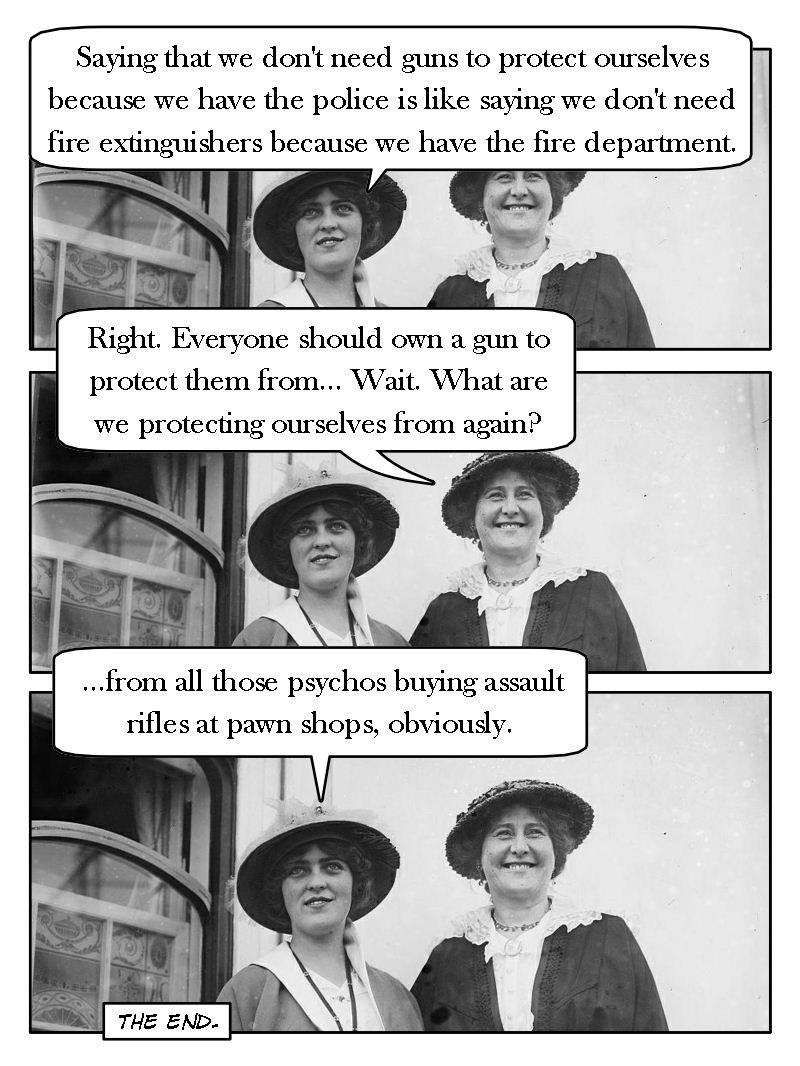 Lady #2: Right. Everyone should own a gun to protect them from… Wait. What are we protecting ourselves from again?