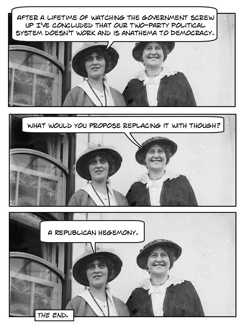 Lady #1: After a lifetime of watching our government screw up I’ve concluded that our two-party political system doesn’t work and is anathema to democracy.