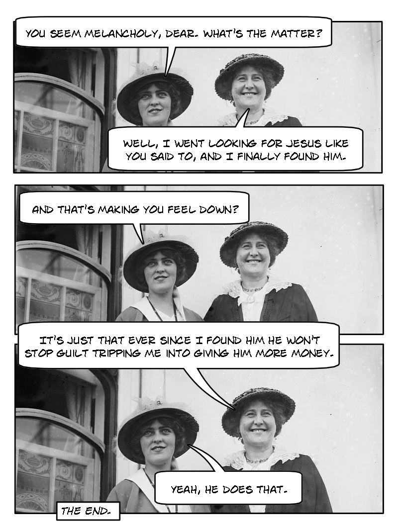Lady #2: Well, I went looking for Jesus like you said to, and I finally found him.