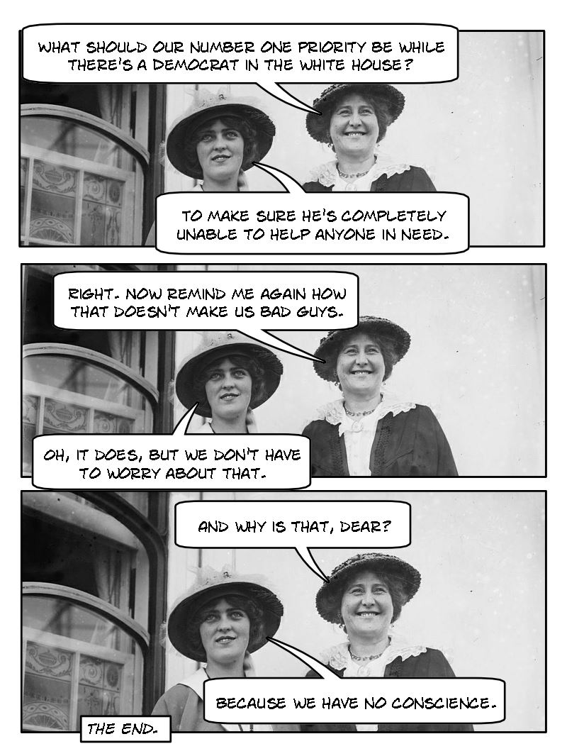 Lady #2: Really? You’re upset about how the rich keep getting bailouts, tax breaks and tax shelters while the poor keep losing social services? I thought you would have been happy to have the nation’s wealth redistributed upwards.
