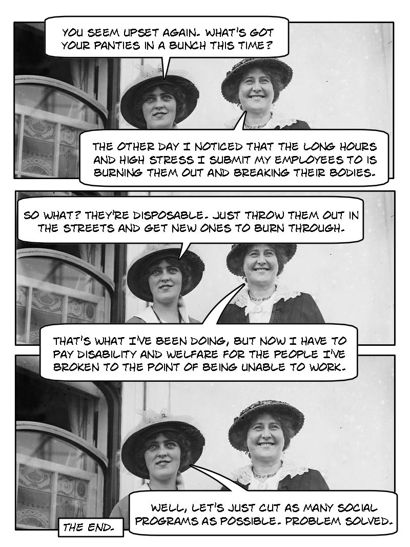Lady #2: That’s what I’ve been doing, but now I have to pay disability and welfare for the people I’ve broken to the point of being unable to work.