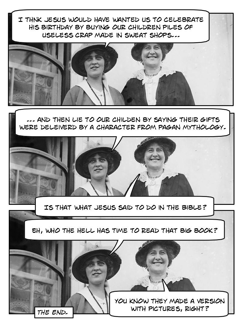 Lady #1: I think Jesus would have wanted us to celebrate his birthday by buying our children piles of useless crap made in sweatshops and then lie to our children by saying that their gifts were delivered by a character from Pagan mythology.