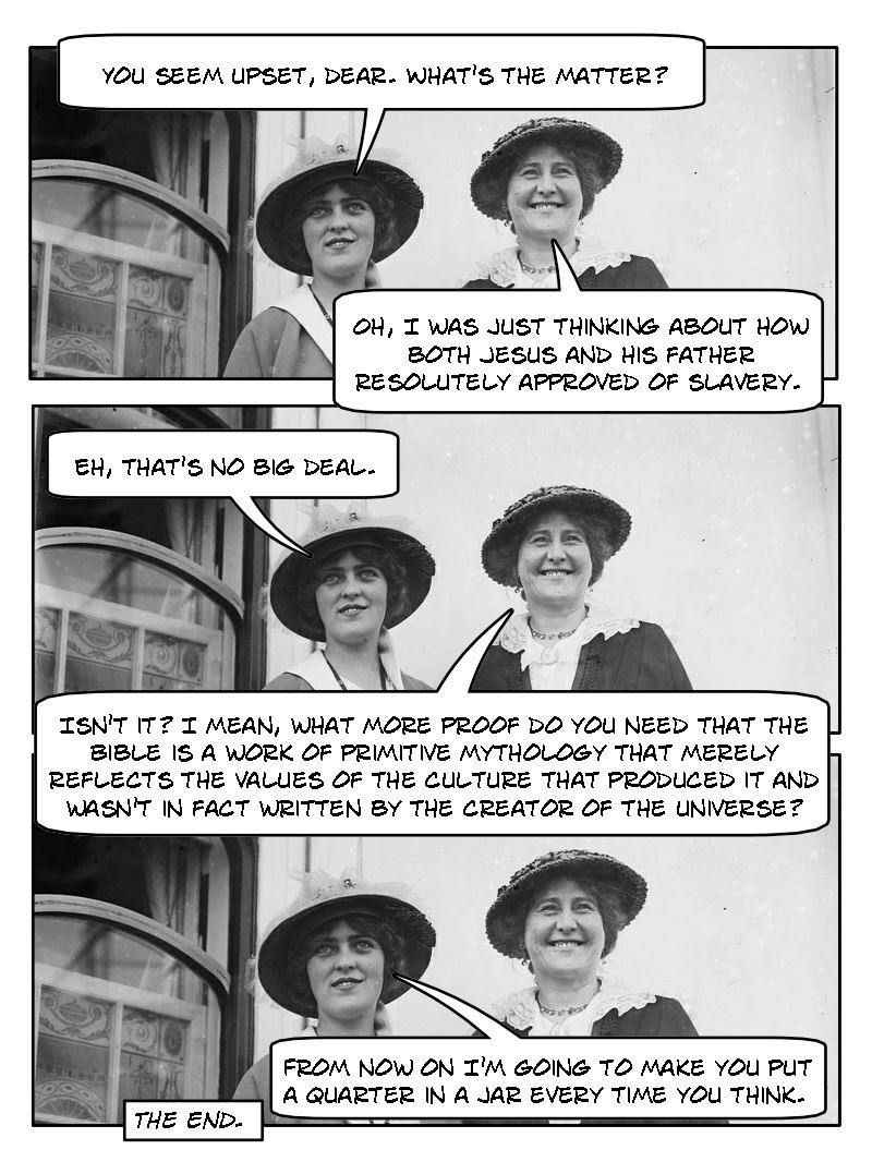 Lady #2: Oh, I was just thinking about how both Jesus and Yahweh resolutely approved of slavery.