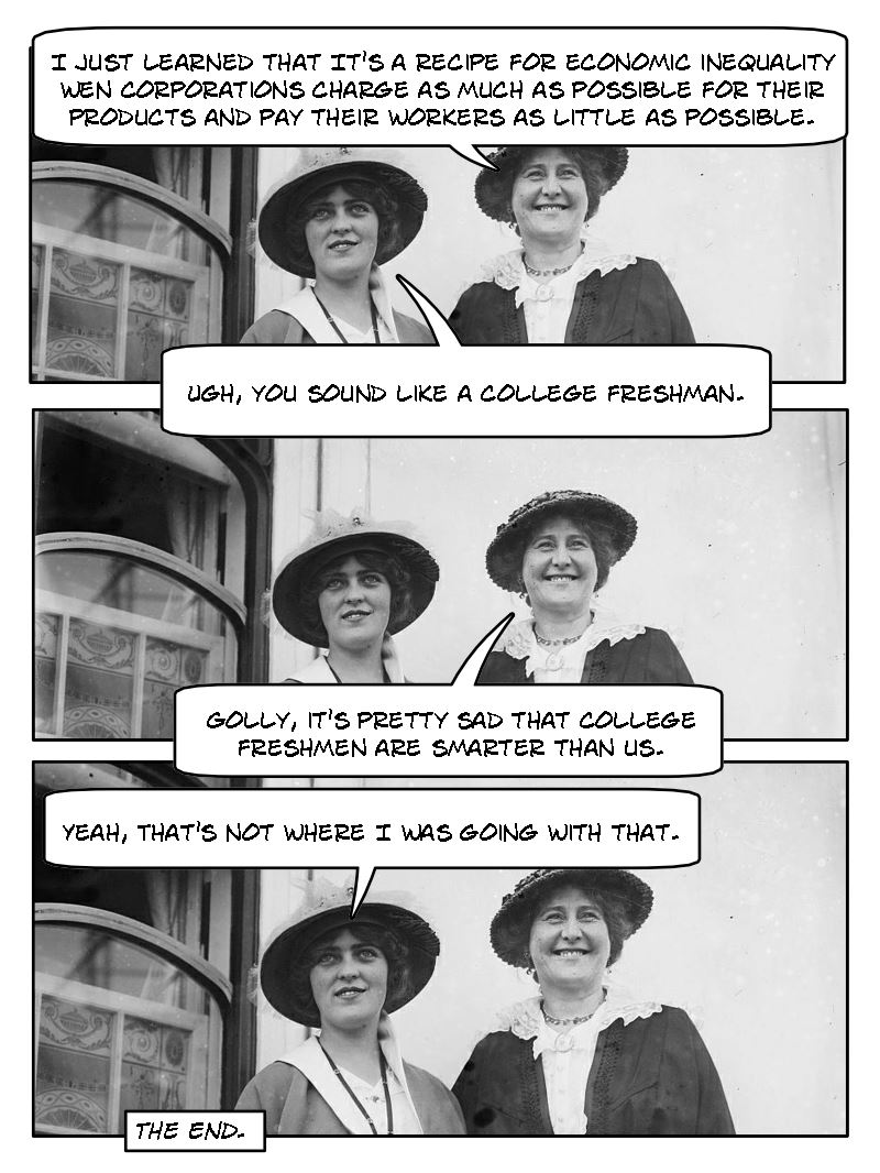 Lady #1: I just learned that it’s a recipe for economic inequality when corporations charge as much as possible for their products and pay their workers as little as possible.