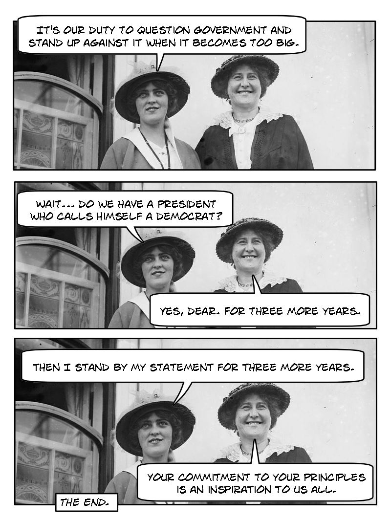Lady #1: It’s our duty to question the government and stand up against it when it becomes too big. Wait… do we have a president who calls himself a Democrat?