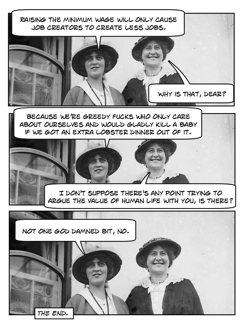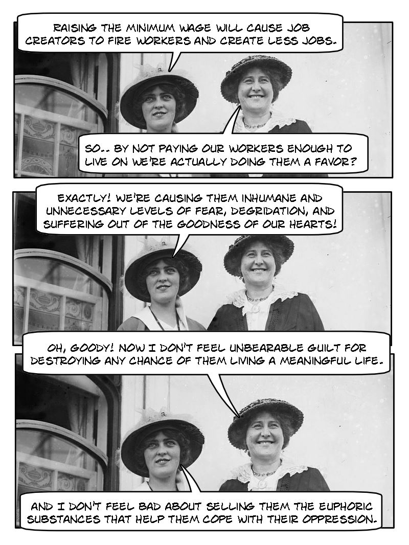 Lady #2: So… by not paying our workers enough to live on we’re actually doing them a favor?