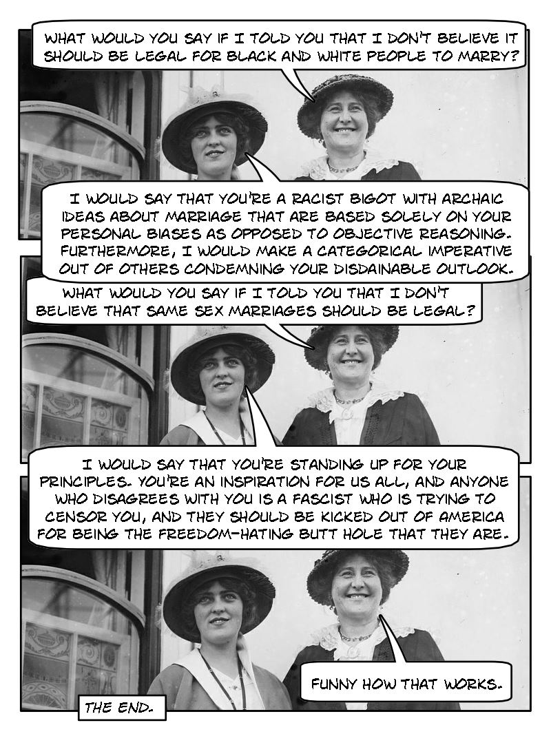 Lady #2: I would say that you’re a racist bigot with archaic ideas about marriage that are based solely on your personal biases as opposed to objective reasoning. Furthermore, I would make a categorical imperative out of others condemning your disdainable outlook.