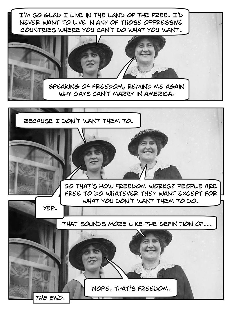 Lady #2: Speaking of freedom, remind me again why gays can’t marry in America.
