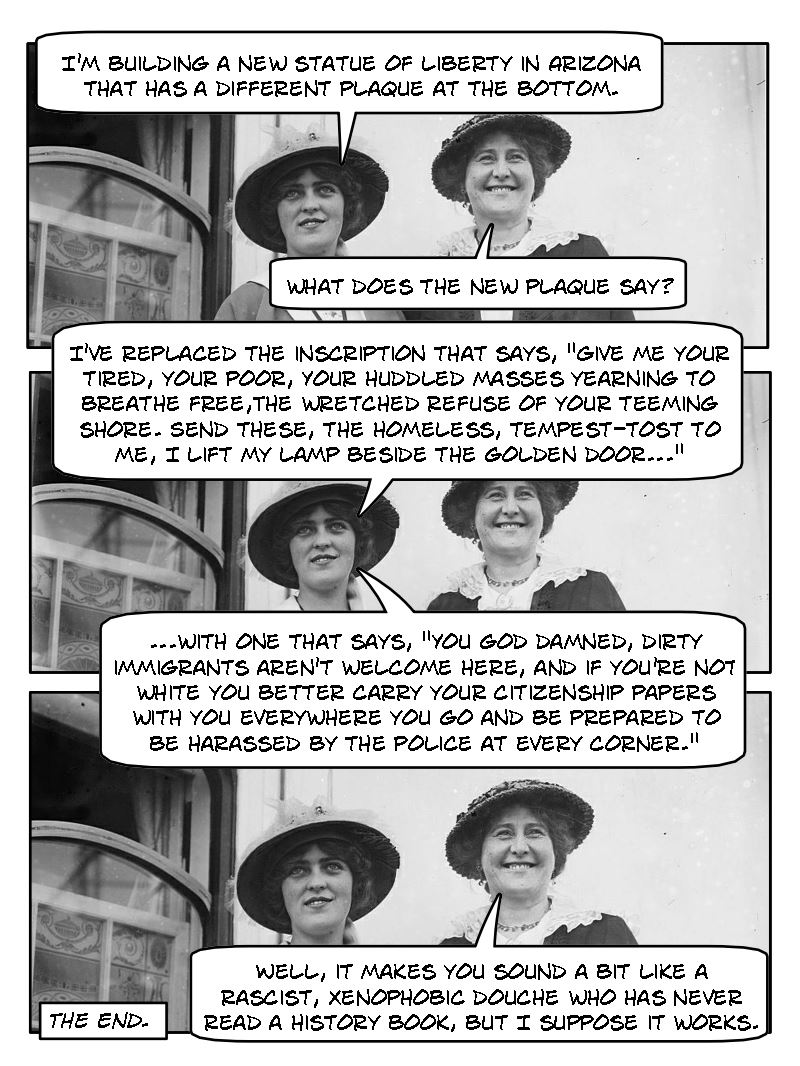 Lady #1: I’ve replaced the inscription that says, “Give me your tired, your poor, your huddled masses yearning to breathe free, the wretched refuse of your teeming shore. Send these, the homeless, tempest-tost to me, I lift my lamp beside the golden door…” with one that says, “You God damned, dirty immigrants aren’t welcome here, and if you’re not white you better carry your citizenship papers with you everywhere you go and be prepared to be harassed by the police at every corner.”