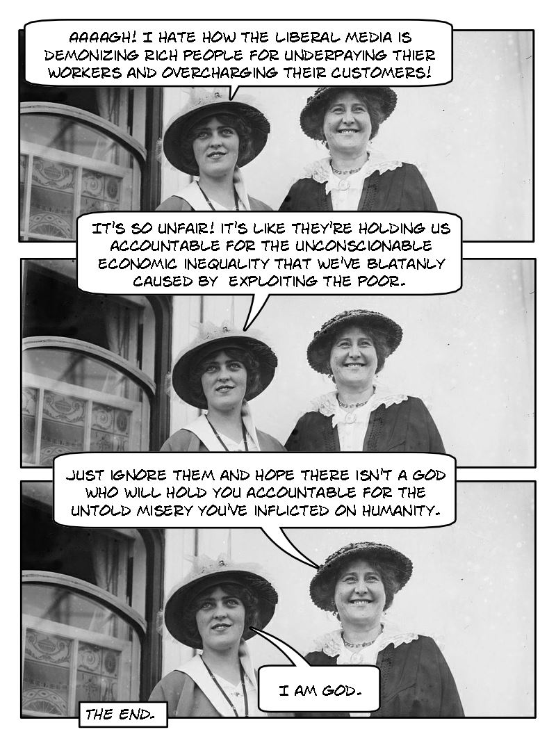 Lady #1: AAAAGH! I hate how the liberal media is demonizing rich people for underpaying their workers and overcharging their customers! It’s so unfair. It’s like they’re holding us accountable for the unconscionable economic inequality that we’ve blatantly caused by exploiting the poor.