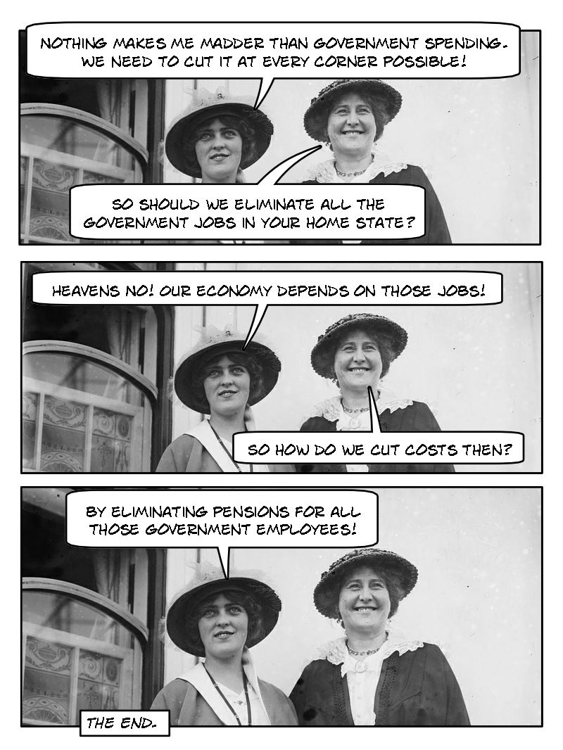 Lady #1: Nothing makes me madder than government spending. We need to cut it at every corner possible!
