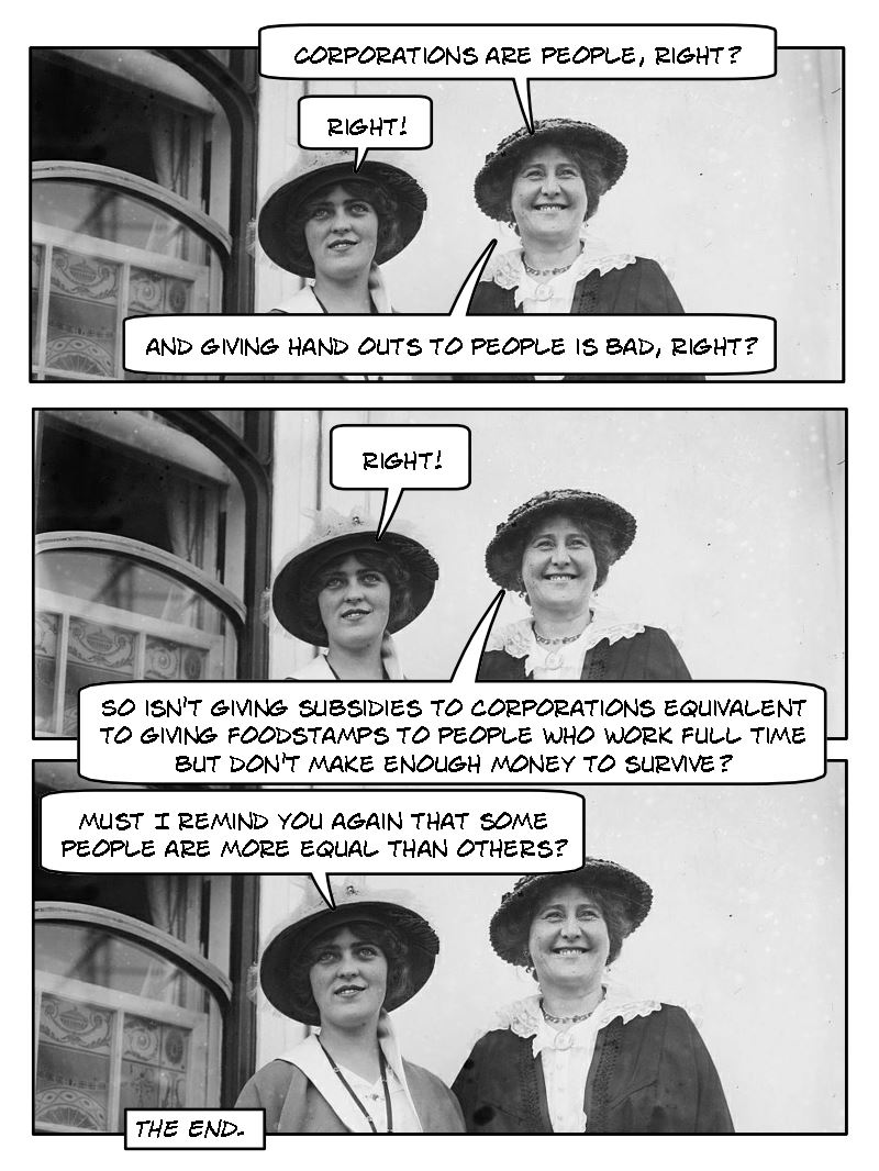 Lady #1: So isn’t giving subsidies to corporations equivalent to giving food stamps to people who work full time but don’t make enough money to survive?