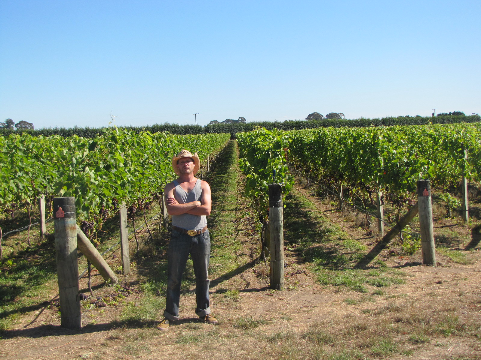 It doesn’t sound difficult to spend 9 hours walking sideways pulling leaves off of vines, and it’s true that there are more difficult jobs in the world, but leaf plucking is a unique form of torture, as every job on a vineyard is in its own way. The leaves grow just low enough that an average sized person has to bend over slightly to grab them. This doesn’t hurt if you do it once, but if you do it for 50 hours a week you’ll be in agony. That’s a fact. Once your back starts hurting from bending forward you can switch to bending your knees so it looks like you’re doing the limbo dance, except instead of going under the wall you go sideways…forever. Eventually, that’s going to hurt too. When that happens you can just fall down on your knees and pick out the leaves at chest height. If you’ve lost the will to get back up you can waddle sideways on your knees and/or crawl down a whole row that way, but you don’t have knee pads. So your knees get beat up on the rocks and twigs. And the ground is covered in a thousand doses of weed killer. So you don’t want what’s down there to get into the cuts, scrapes, and blisters in your hands and knees.